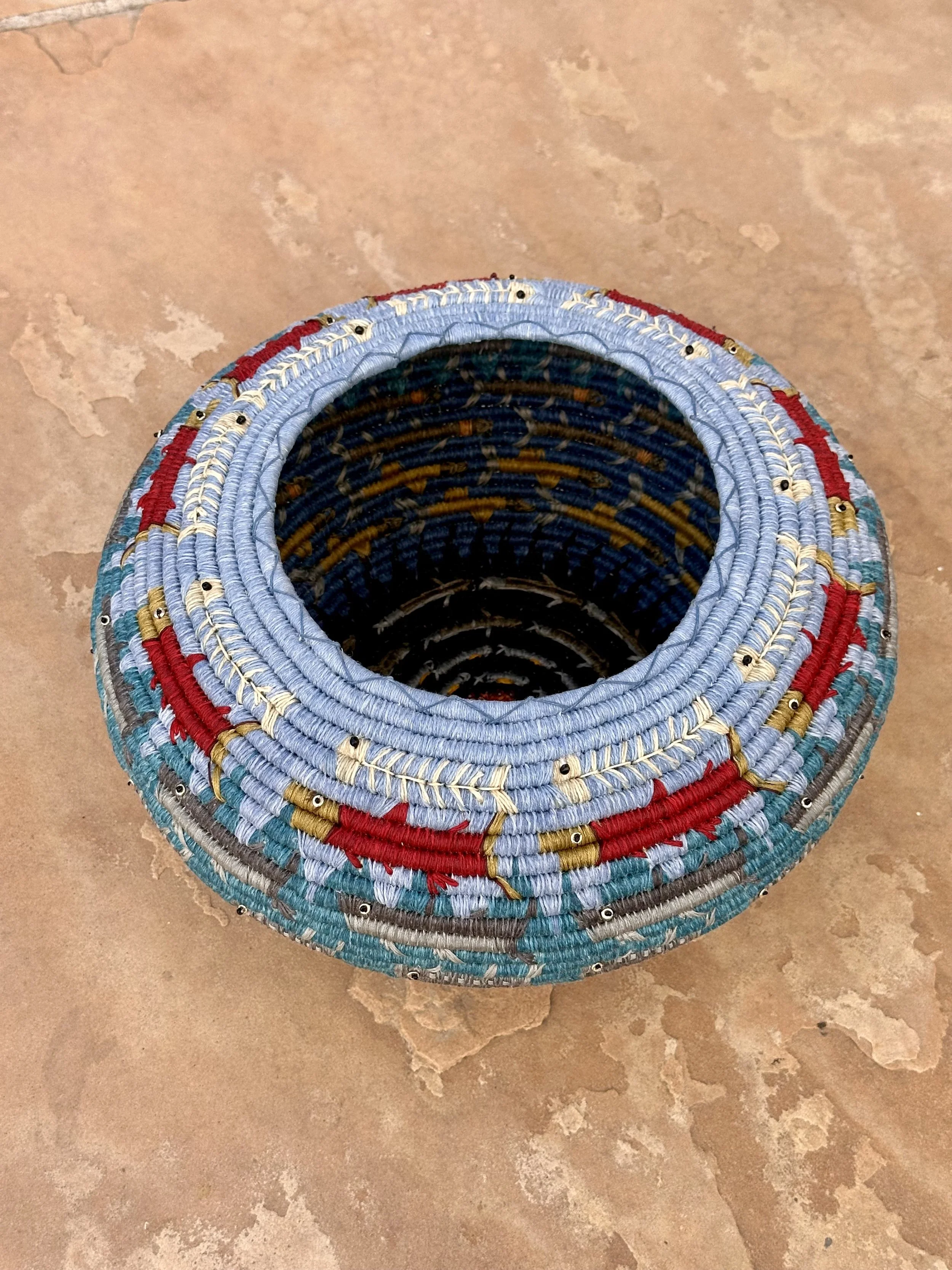The oval shaped basket is one of the more difficult baskets to coil to because the shaping must be consistent throughout. The lightning design featured is a symbol used in many baskets it signifies an approaching storm.